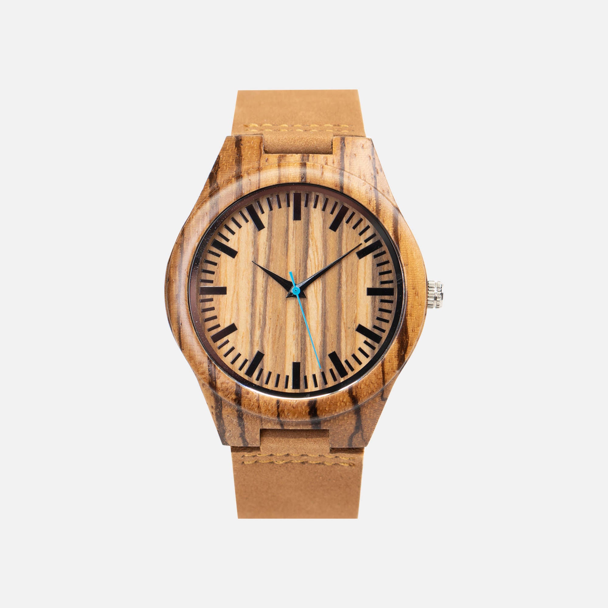The Blue Forest - this men’s wood watch blends classic design with natural zebrawood, featuring a blue second hand for a subtle pop of color. It is finished with a tan full-grain leather band that balances durability, comfort, and a polished look.