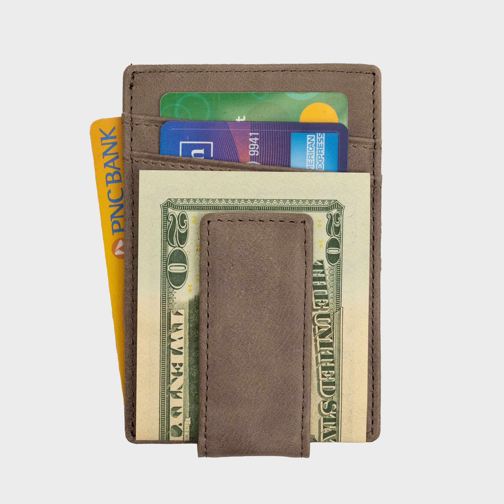 Magnetic clip secures several bills and flips down for quick access to cash.