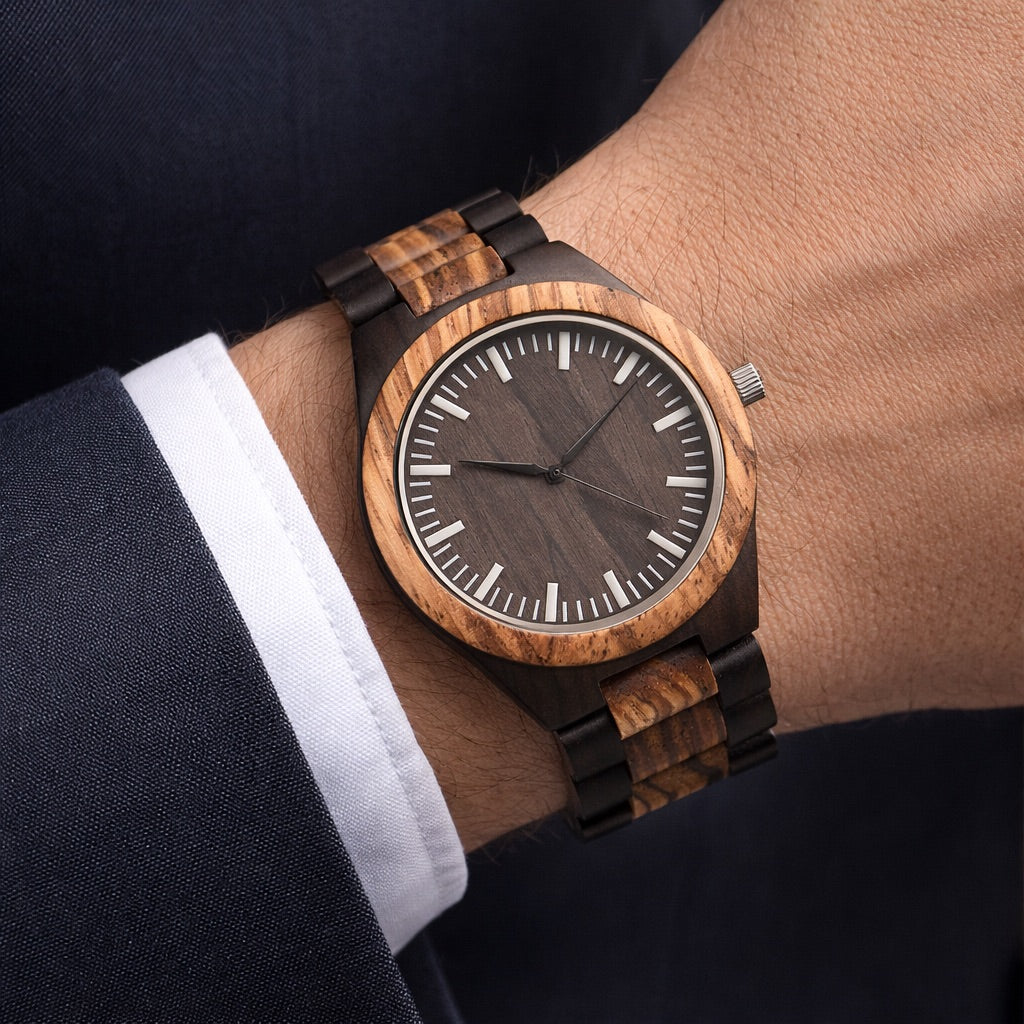 Silverton is a wood watch made from natural zebra and sandalwood and has an all wood band that can be adjusted by removing wooden links. Black hand movements and silver minute markers.