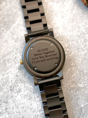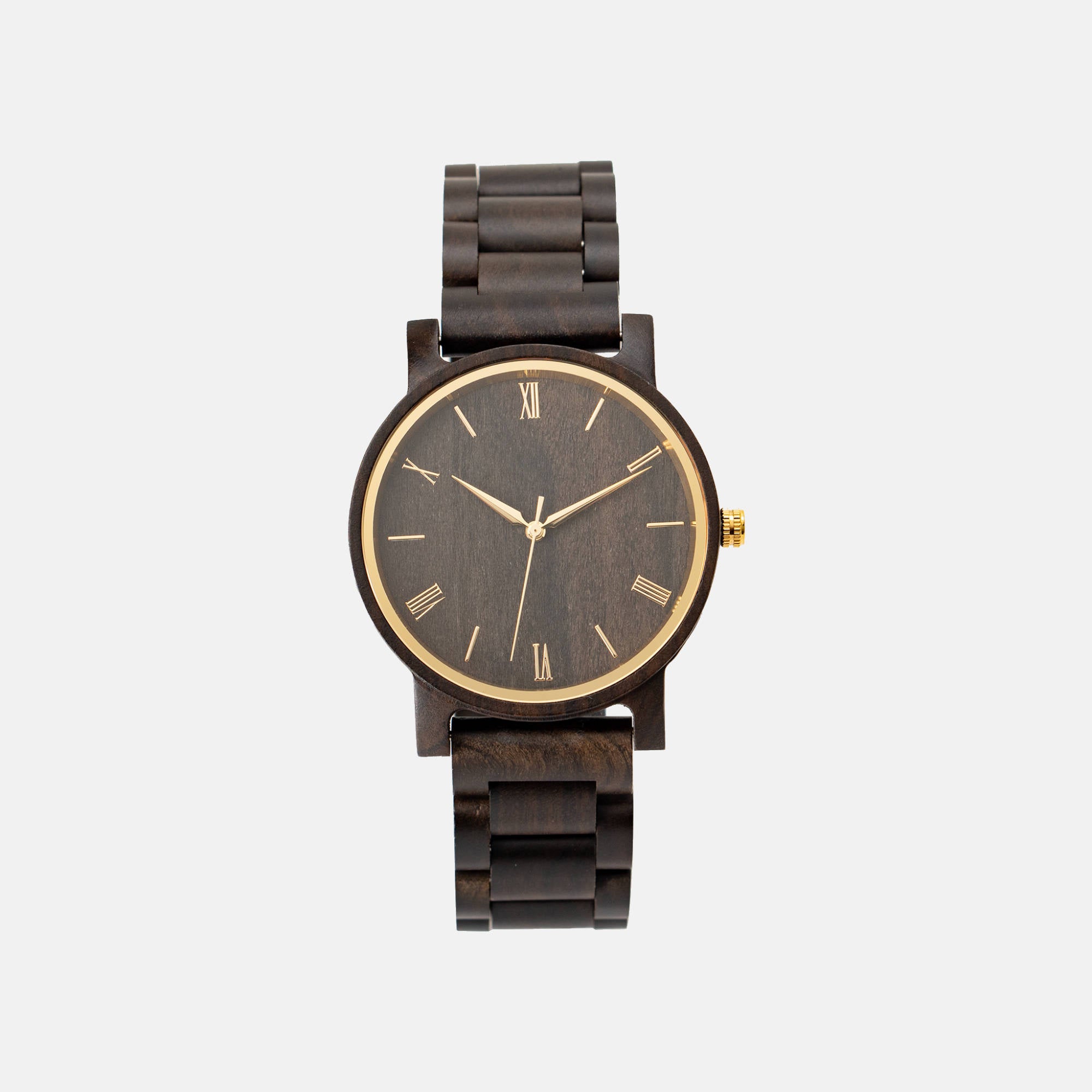 Wood watch made from natural wood and has an all wood band that can be adjusted by removing wooden links. Gold hands and hour markers, stainless steel clasp.